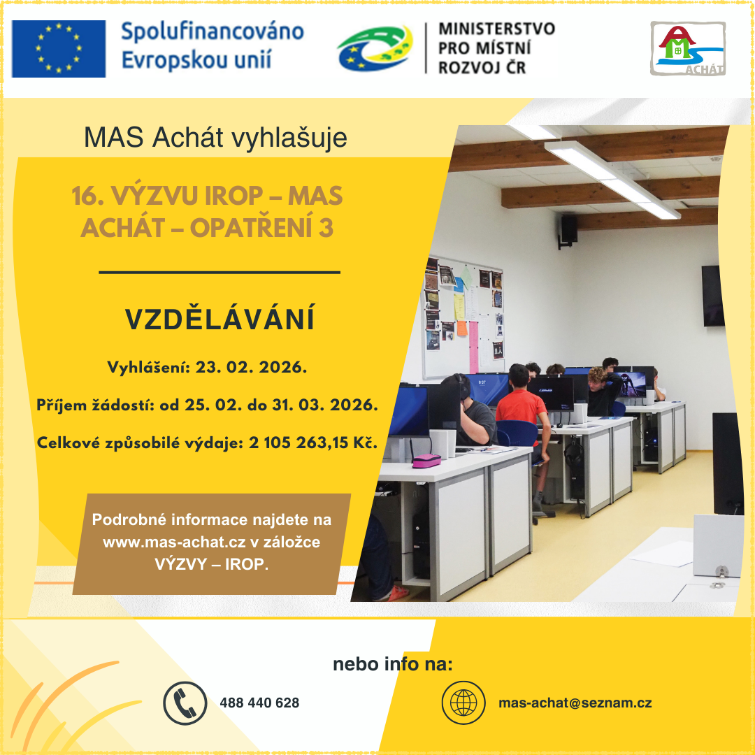 • 16.výzva IROP – MAS Achát – opatření 3 VZDĚLÁVÁNÍ                             alokace  2.000.000,-