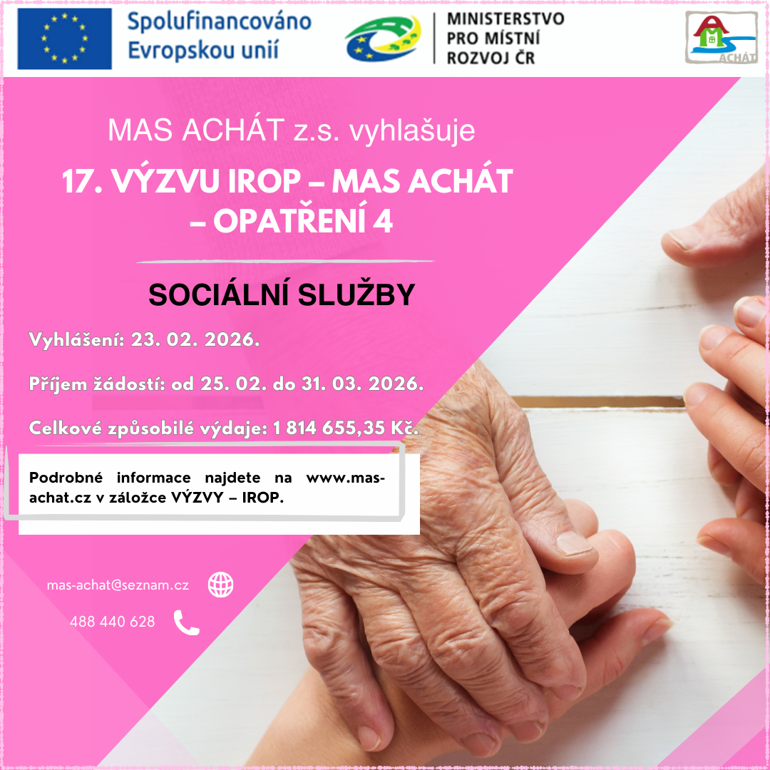 • 17.výzva IROP – MAS Achát – opatření 4 SOCIÁLNÍ SLUŽBY                   alokace  1.723.922,59
