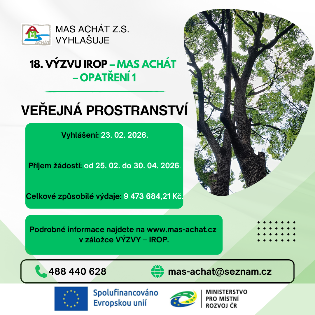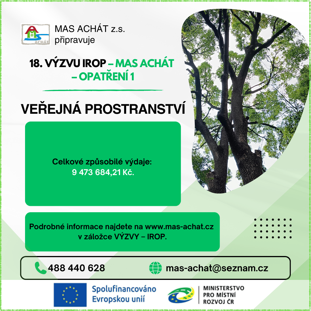 • 18.výzva IROP – MAS Achát – opatření 1 VEŘEJNÁ PROSTRANSTVÍ     alokace  9.000.000,-